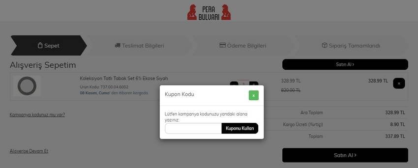Sitemiz üzerinde Pera Bulvarı mağazasına ait Pera Bulvarı Kupon kodu, Pera Bulvarı Alışveriş çeklerini kopyalayıp ödeme sayfasında cazip indirimlerden faydalanabilirsiniz.