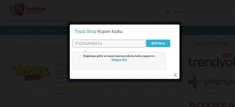 Sitede kuponlara tıkladığınızda yukarıdaki gibi bir pencere açılacak. Burada tek yapmanız gereken açılan Toyzz Shop indirim kuponunu kopyala demek.