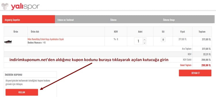 Karşınıza çıkan ekranda hem kod hem de sizi doğrudan yalispor.com.tr adresine yönlendirecek bir link yer alacaktır. “Siteye Git” linkini tıkladığınızda alışveriş keyfinize hız kesmeden devam edebilirsiniz. Alacağınız ürünleri sepete eklediğinizde ekranda indirim kuponunuzun otomatik olarak doldurulduğunu görürsünüz. Eğer indirim kodu alanı boş ise indirimkuponum.net adresinden aldığınız kodu elle girebilirsiniz.