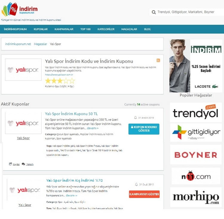 Sitemize giriş yaptıktan sonra ana sayfada bulunun akıllı kupon arama modülüne indirim almak istediğiniz markanın adını yazarak ilgili sayfaya yönlendirilirsiniz. Akıllı arama alternatifinden yararlanmak istemezseniz yine ana sayfamızda bulunan “Mağazalar” kategorisine tıklayabilir, alfabetik olarak sıraladığımız marka isimleri arasında Yalıspor’u bulabilirsiniz. Bu noktada zaman kazanmak için “Y” harfine tıklayarak doğrudan Y ile başlayan markalar arasından Yalıspor’u seçebilirsiniz. Seçiminizi tamamladığınızda Yalıspor indirim kodu ve Yalıspor kupon seçenekleri arasından hem aktif olanları hem de yakalamakta geç kaldıklarınızı görüntüleyebilirsiniz.